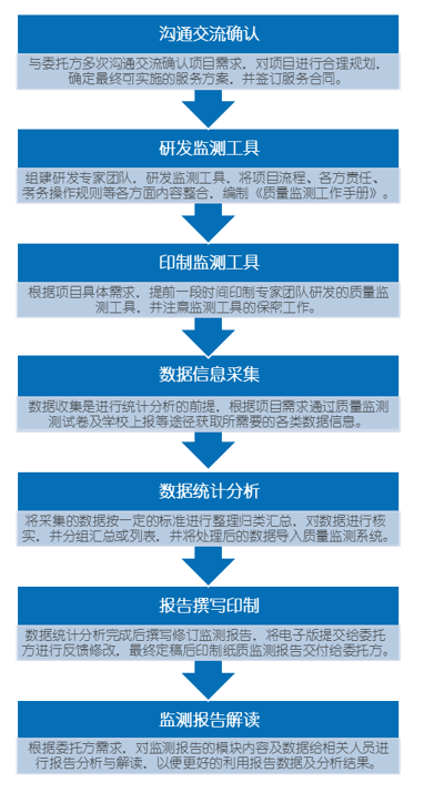 2008年,國(guó)內(nèi)開(kāi)始了國(guó)家級(jí)教育質(zhì)量監(jiān)測(cè)的研究;2009年公司聘任相關(guān)專家參與了最初的質(zhì)量監(jiān)測(cè)指標(biāo)的修訂,并作為國(guó)家視導(dǎo)員先后5年參與了在貴州、內(nèi)蒙、寧夏等地的質(zhì)量監(jiān)測(cè)試點(diǎn)工作。公司在參考國(guó)家質(zhì)量監(jiān)測(cè)標(biāo)準(zhǔn)的基礎(chǔ)上,以不低于國(guó)家教育質(zhì)量監(jiān)測(cè)標(biāo)準(zhǔn)進(jìn)行,另外還參考了國(guó)際幾大主流機(jī)構(gòu)測(cè)評(píng)方法。