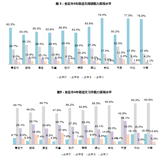 監(jiān)測(cè)采用分層整群隨機(jī)抽樣,先將青島市按照行政區(qū)劃分為了10個(gè)抽樣分樣本,根據(jù)各區(qū)市的地理位置、城鄉(xiāng)學(xué)生比例、教育經(jīng)濟(jì)發(fā)展?fàn)顩r、學(xué)校類型等因素在每個(gè)區(qū)市中隨機(jī)抽取12所學(xué)校,每個(gè)學(xué)校抽取4年級(jí)(由于測(cè)試時(shí)間為2015年1月,實(shí)際測(cè)試目標(biāo)群體已升入5年級(jí),但測(cè)試內(nèi)容仍為4年級(jí)所學(xué)內(nèi)容)60名學(xué)生(不足60人按照實(shí)際人數(shù))進(jìn)行語文學(xué)業(yè)水平測(cè)試以及學(xué)生調(diào)查問卷的填答。本次調(diào)查問卷同時(shí)包括樣本校的340名語文教師和120名校長。